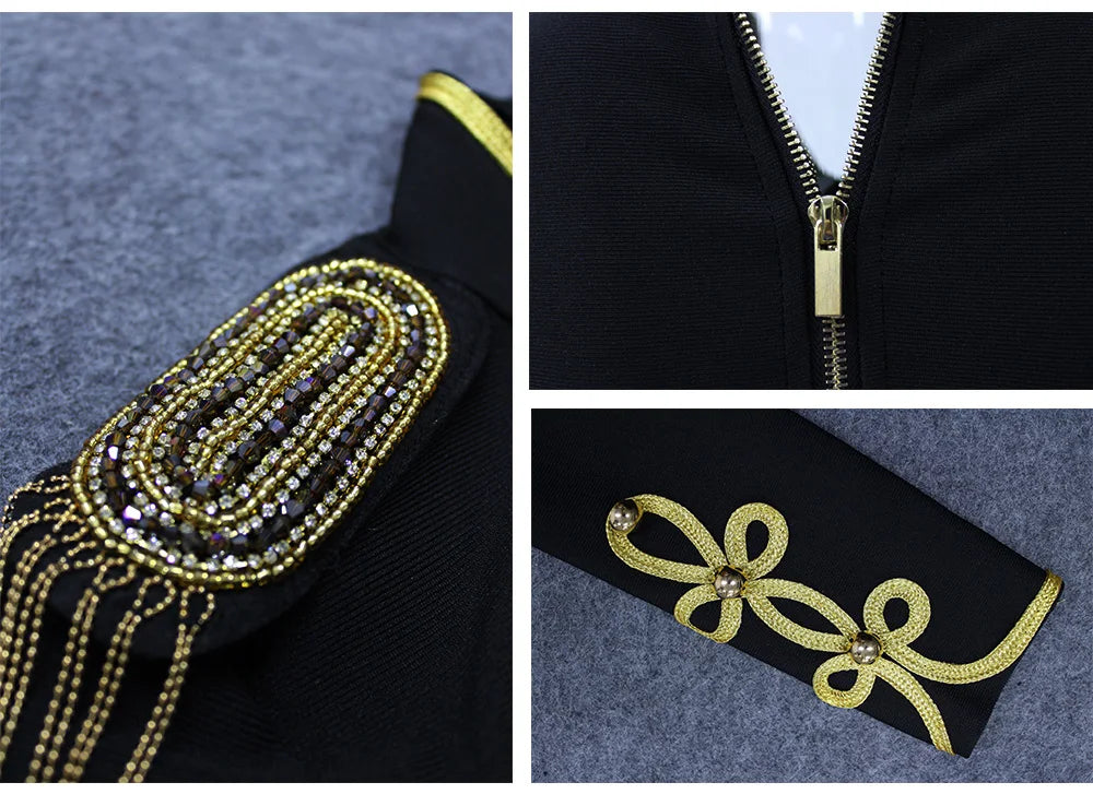 Style and Glamour: The black jacket with gold embroidery and pearl fringe details on the shoulders ensures a sophisticated and exclusive look, making the piece stand out at any party.