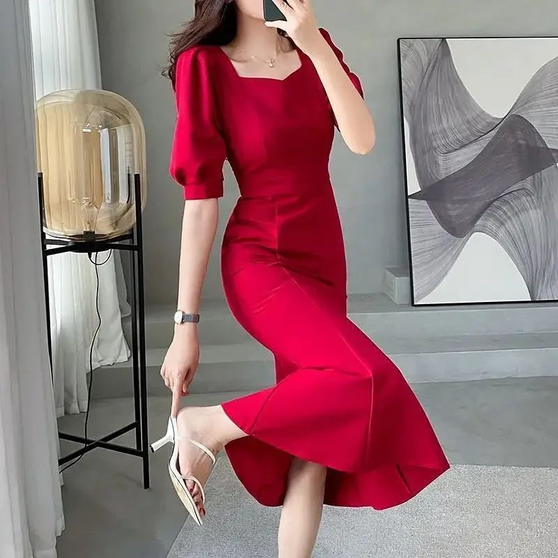 Chic Women’s Ball Gown – Square Collar Puffy Sleeve Fish Tail Dress