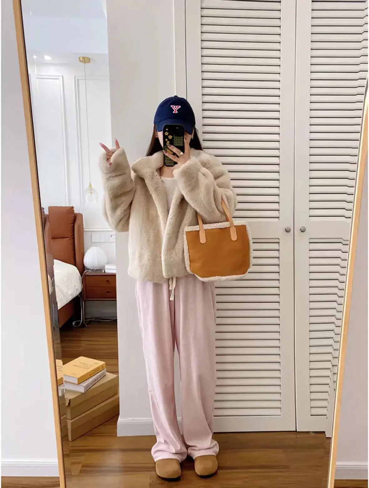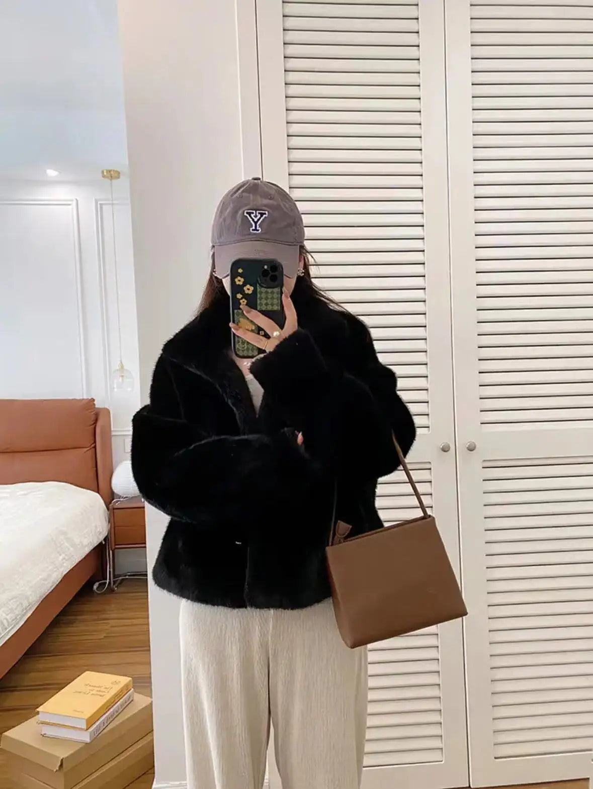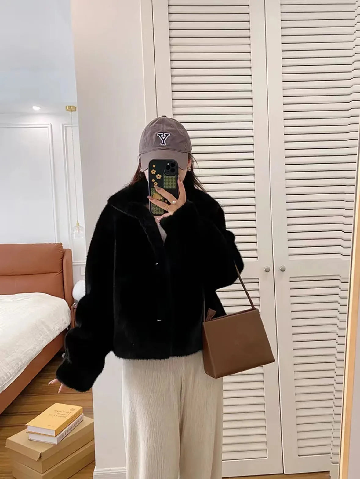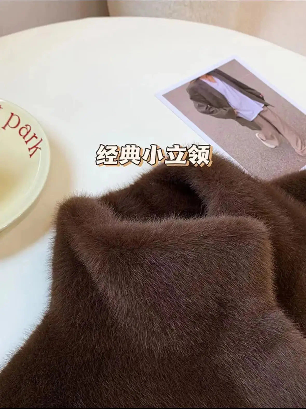 Golden Mink Lined Faux Fur Coat – Short Stand Collar Winter Jacket