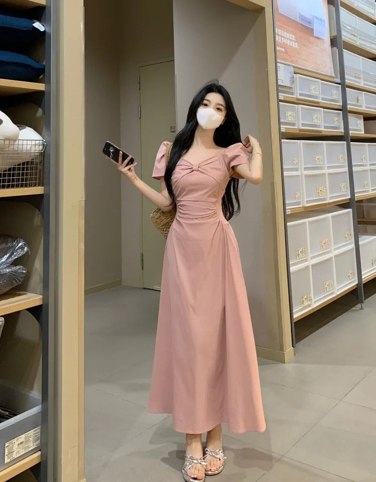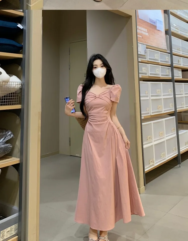 The V-neckline and bubble sleeves add a touch of vintage flair, while the mid-length cut keeps the look modern and versatile.