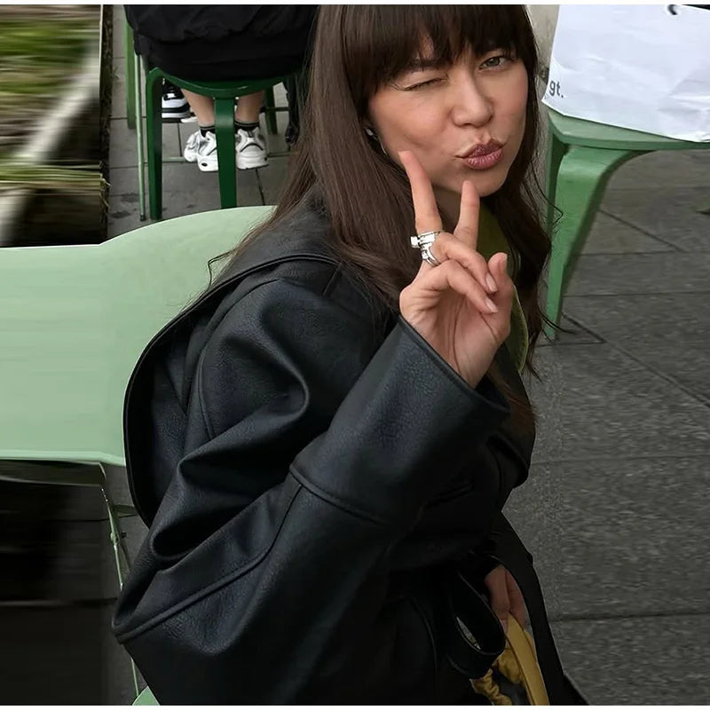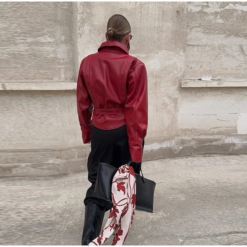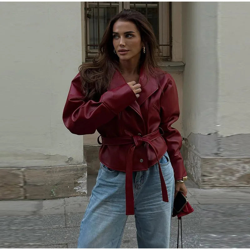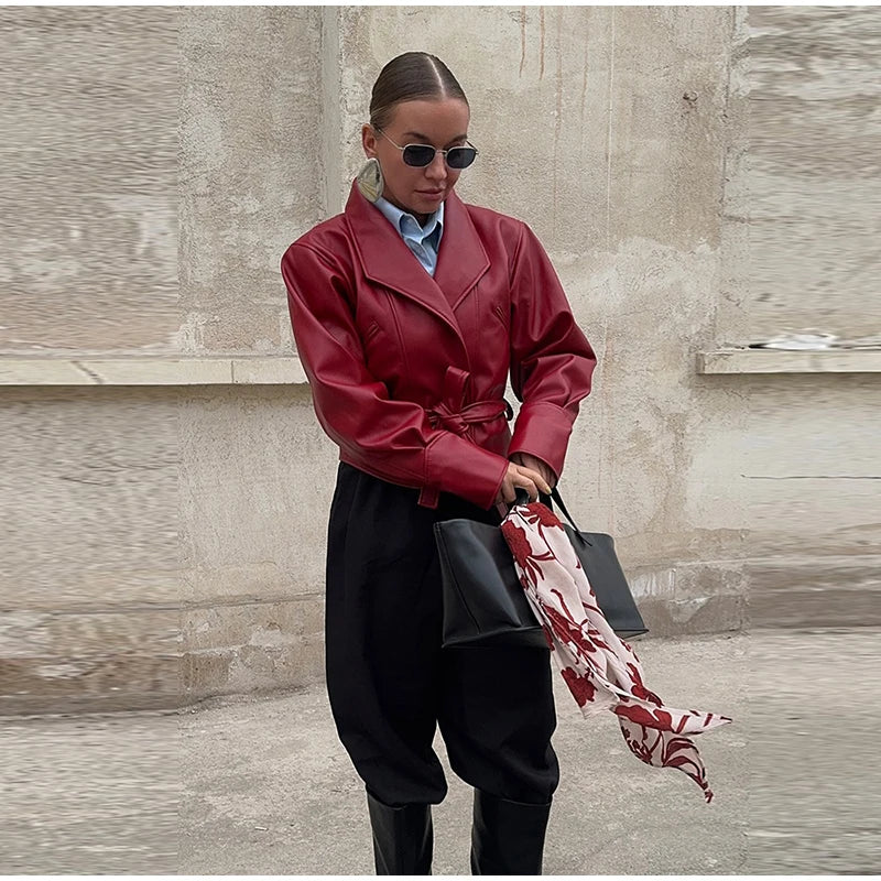 Your search for a piece that highlights your personality and elevates your style to a new level ends here! We present the Short Faux Leather Jacket. This jacket is the ultimate solution for your days of fashion uncertainty, ensuring you feel confident and stylish at all times. 🔑 With its faux leather design, contrasting lapel collar, and waist tie, it offers the ideal combination of sophistication and modern functionality, perfect for any occasion. ✨