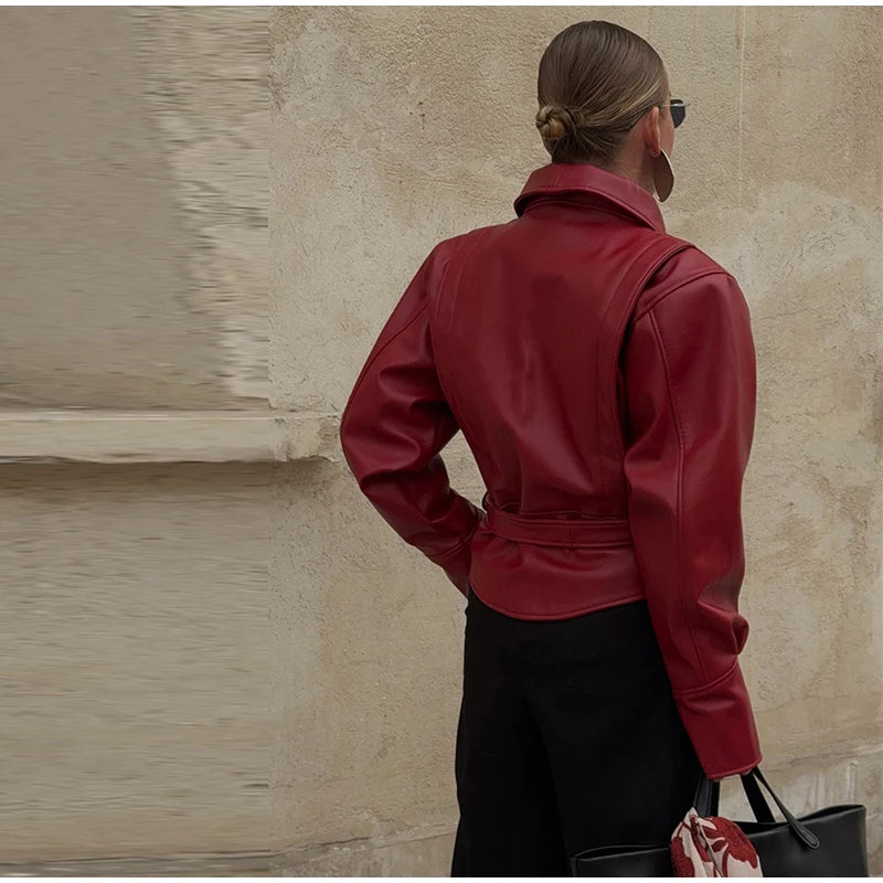 Short Faux Leather Jacket – Women’s Pockets Belt Turn-down Collar Coat