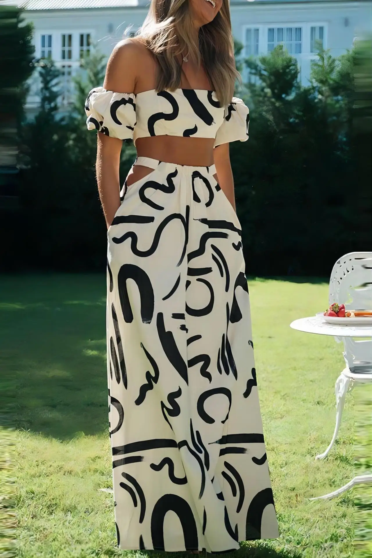 Elegant Women’s Set – Puff Sleeve Top & Hollow Waist Big Hem Dress